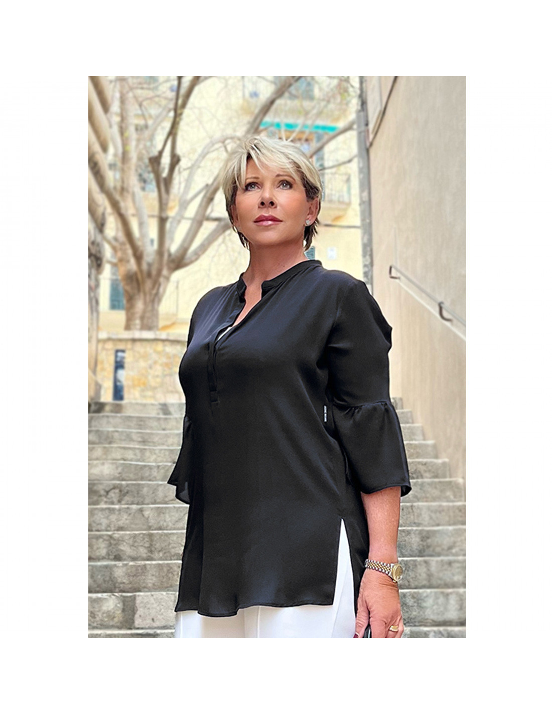 Extra lange Volant-Bluse in schwarz
