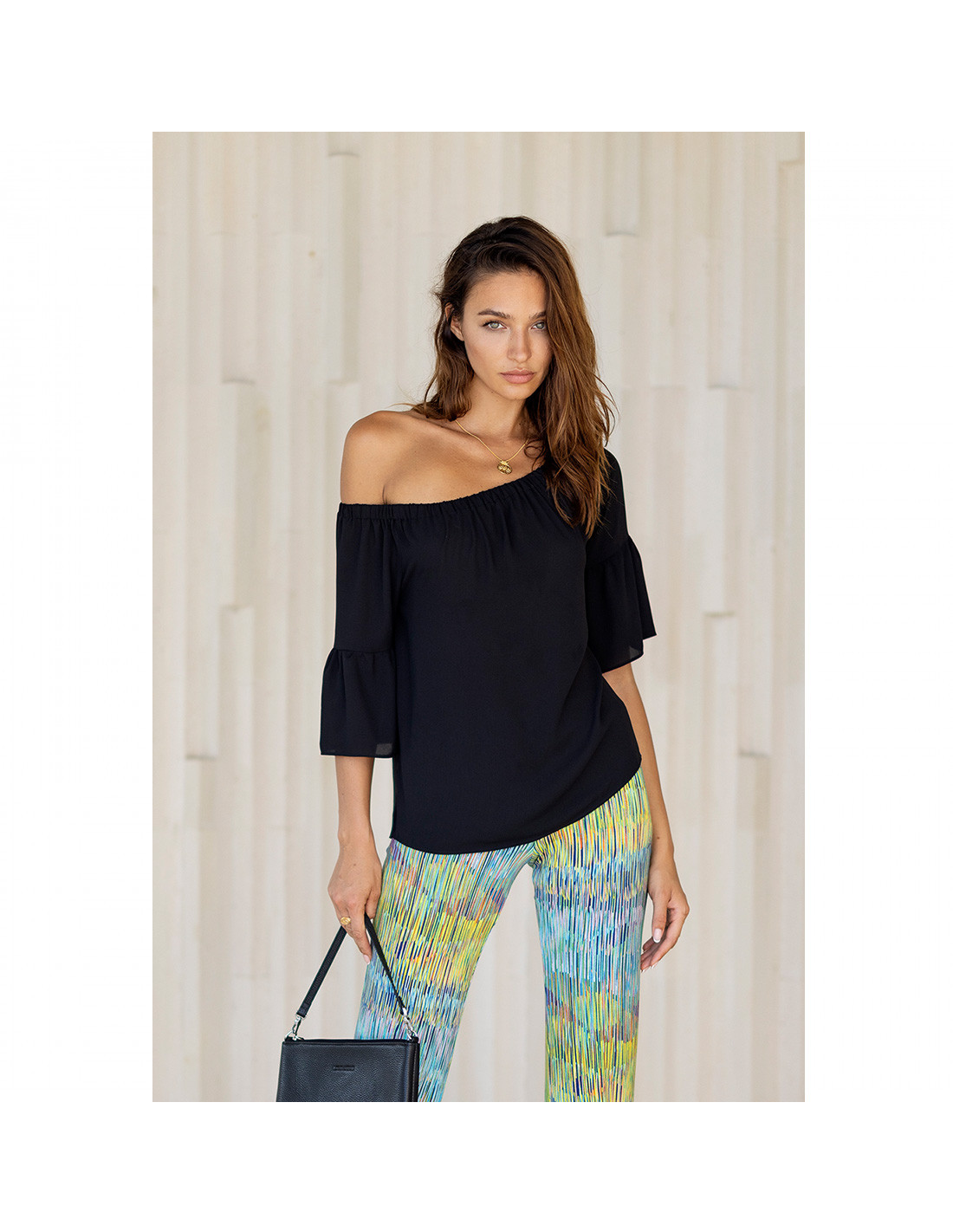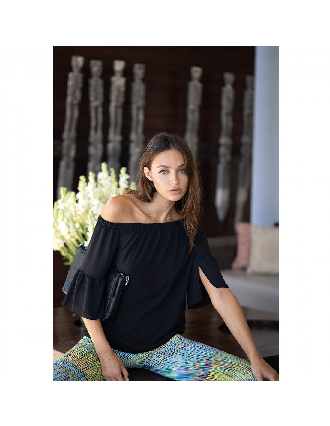 Dieses schöne und fließende Oberteil ist perfekt, wenn Sie Ihre romantische Seite hervorheben wollen. Der Carmenausschnitt betont das Schlüsselbein auf eine schmeichelnde Weise. Die Volant-Ärmel geben reichlich Platz, um sich frei zu bewegen und das luftige Material ist perfekt für wärmere Tage.